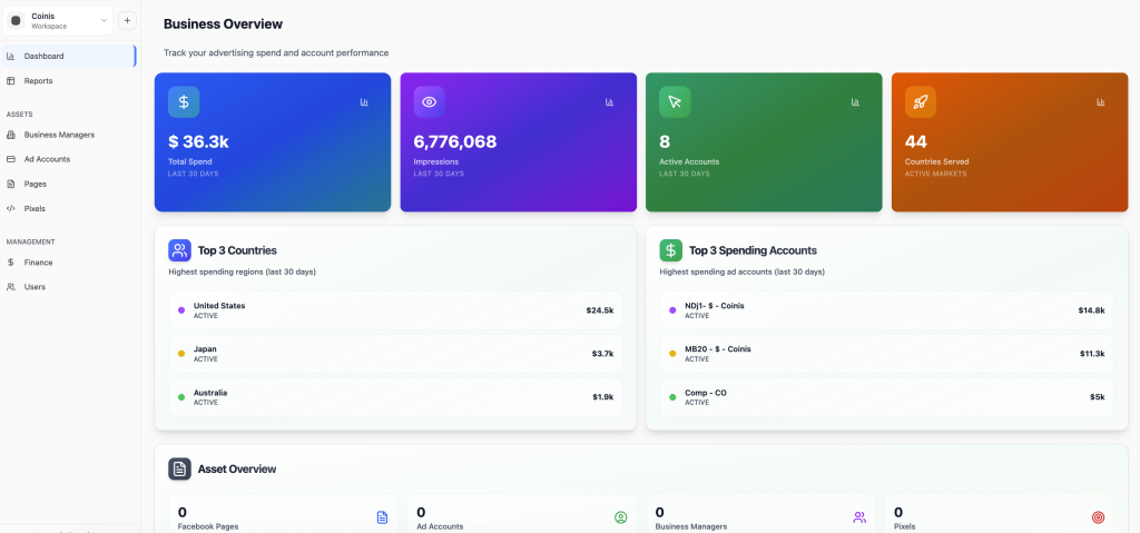 Add users and assign roles in seconds, request verified Business Managers directly through the platform, and manage ad accounts, Pages, and Pixels under one dashboard.