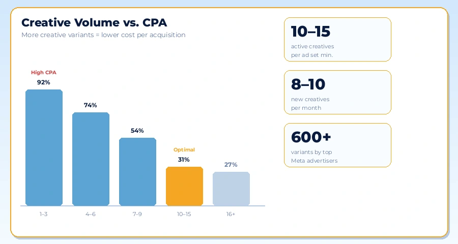 The most widespread Meta Ads mistake at scale isn’t budget allocation or audience targeting. It’s creative underinvestment. Not in production quality, but in raw volume.